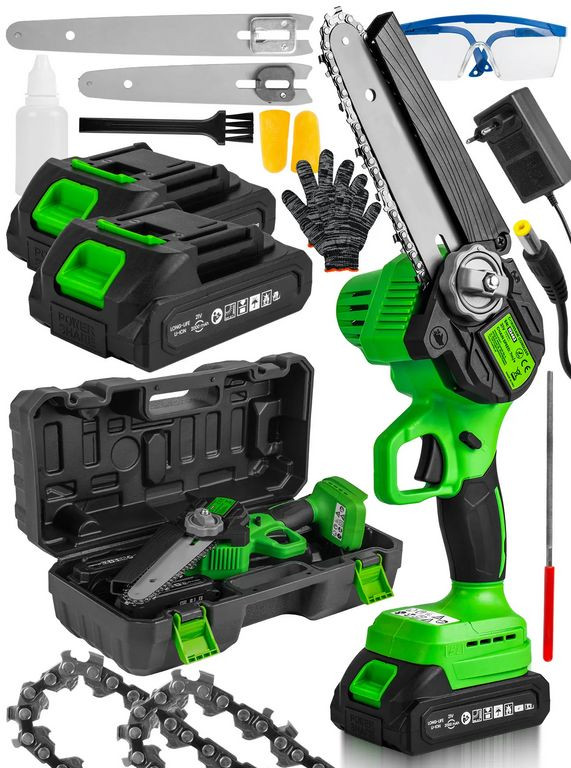 1000W akkus mini láncfűrész 6" és 8" vezetőlap, 2 akku, automatikus láncolajozás