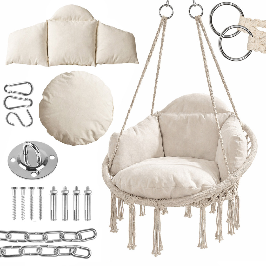 Kényelmes és stílusos függőfotel extra vastag párnával, amely ideális választás kertbe, teraszra vagy akár lakásba is. A bohém makramé kialakítás és az XL méretű ülőfelület tökéletes pihenősarkot teremt.